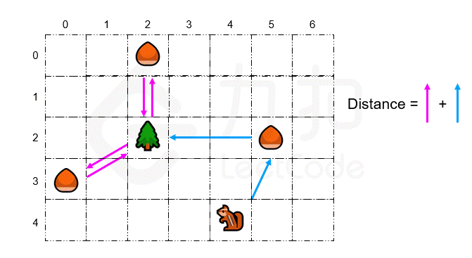现在有一棵树,一只松鼠和一些坚果。位置由二维网格的单元格表示。你的目标是找到松鼠收集所有坚果的最小路程,且坚果是一颗接一颗地被放在树下。松鼠一次最多只能携带一颗坚果,松鼠可以向上,向下,向左和向右四个方向移动到相邻的单元格。移动次数表示路程。