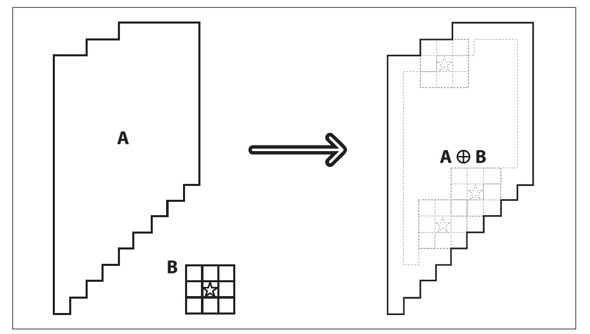 膨胀可以理解为 B 的中心(锚点)沿着 A 的外边界走了一圈。膨胀是对高亮部分而言,A 区域之外的部分 < A 的高亮像素,所以外面被里面取代。