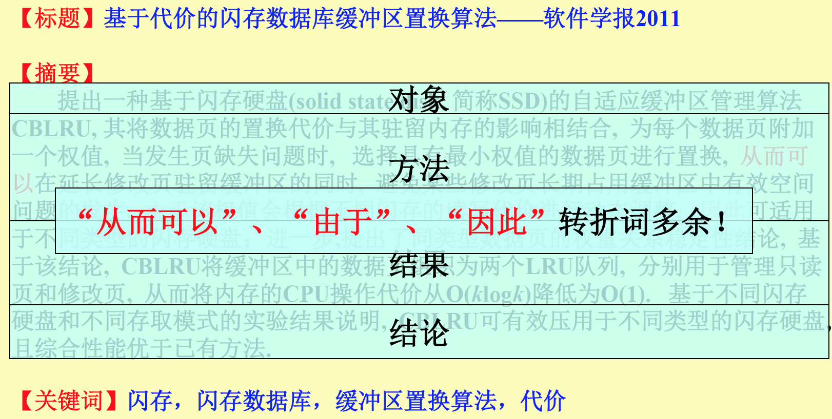 - 让读者在短时间内抓住 论文重点 与 贡献。