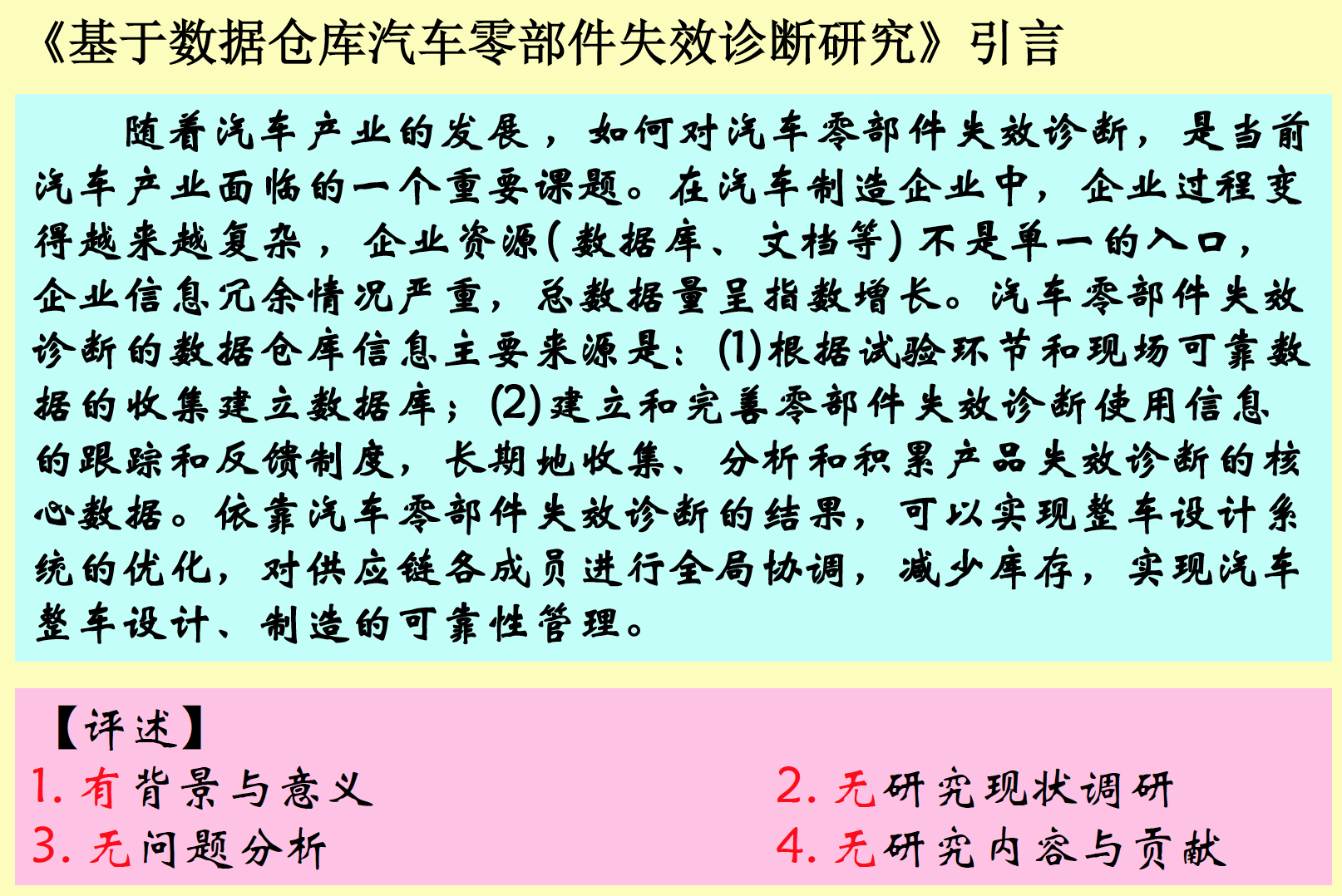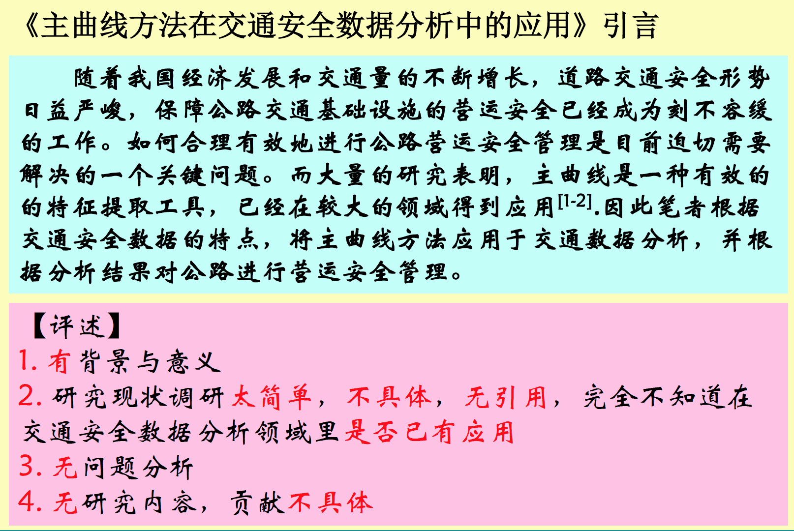- 文献阅读不深入,简单罗列,“综”而不“述”:仅仅是观点罗列,缺乏系统分类、归纳和提炼。
