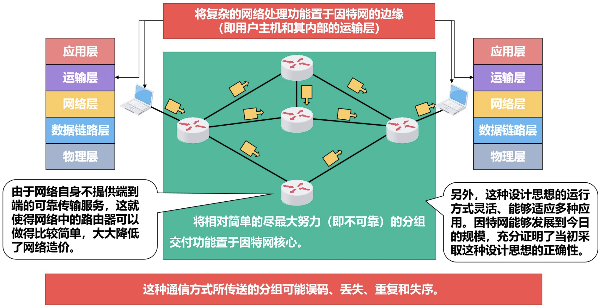 无连接的数据报服务的核心思想是 “可靠通信应当由用户主机来保证”。因特网就采用了这种设计思想。