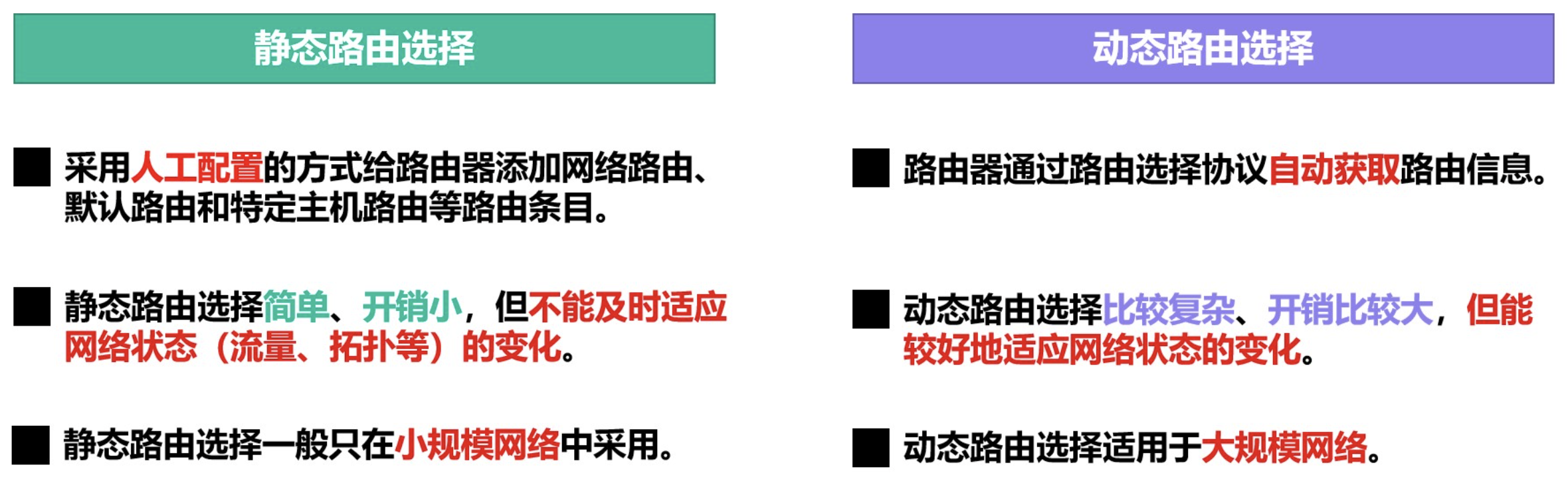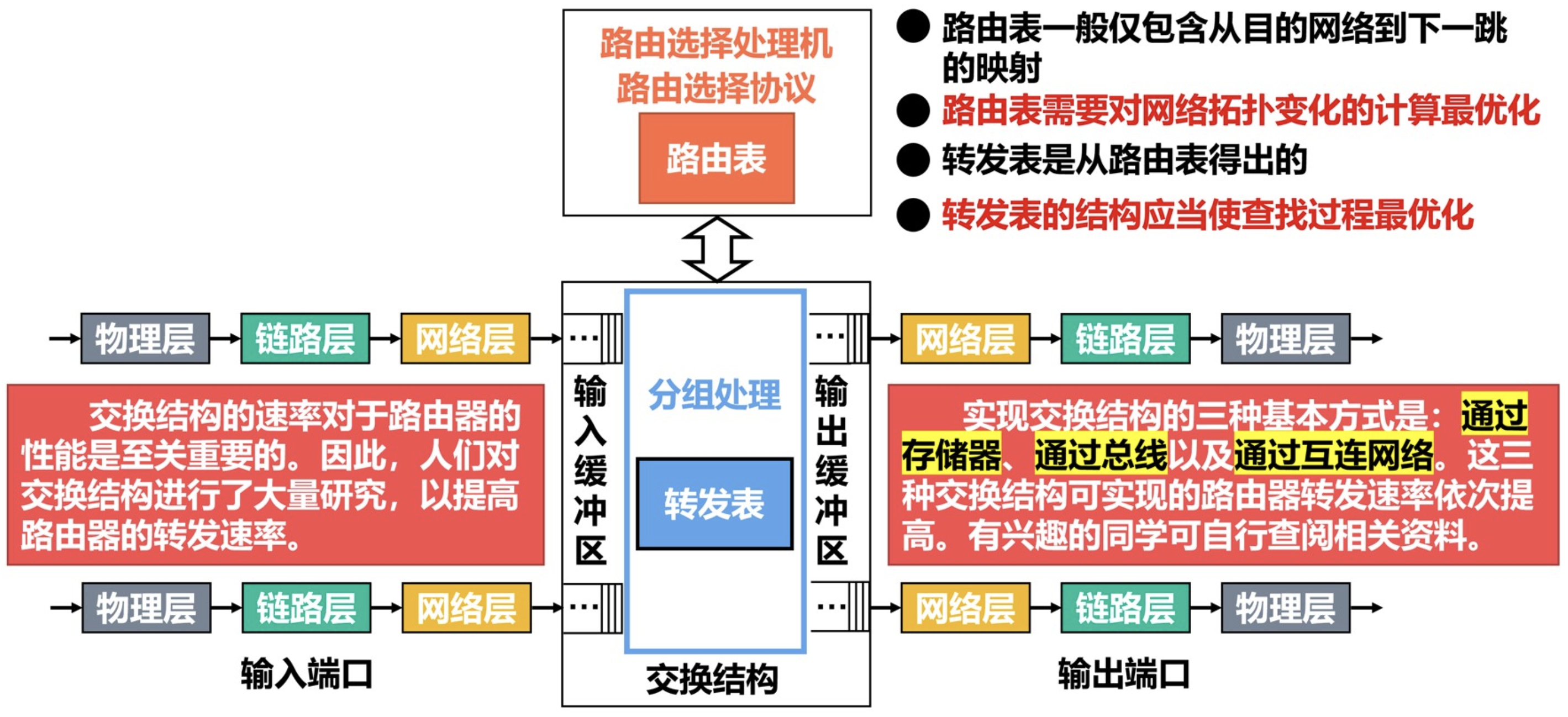 - 路由选择部分:核心构件是路由选择处理机,其任务是根据所使用的路由选择协议,周期性地与其他路由器进行路由信息的交换,以便构建和更新路由表。