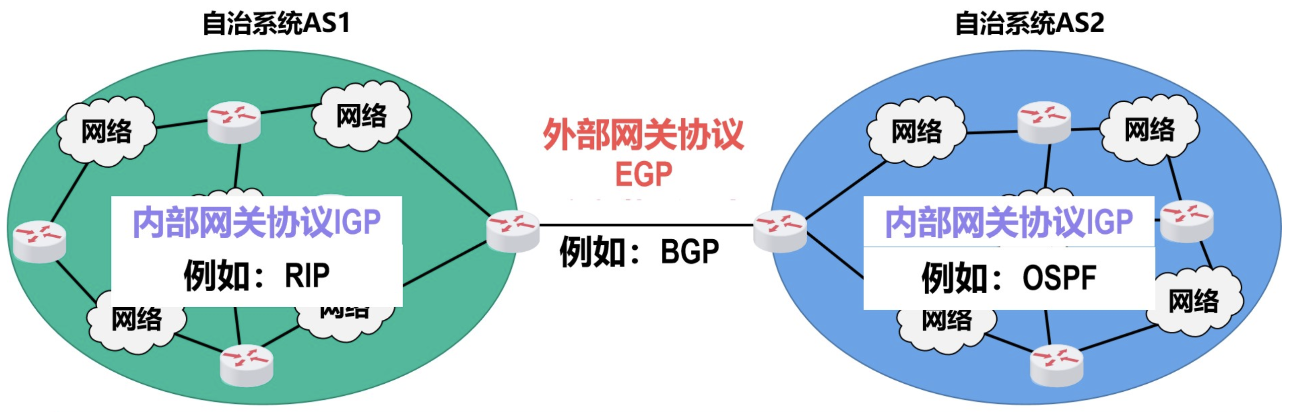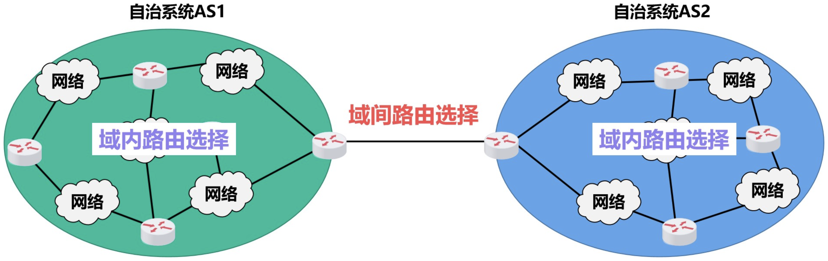 - 分层次:将整个因特网划分为许多较小的自治系统(Autonomous System,AS),在自治系统内部和外部采用不同类别的路由选择协议,分别进行路由选择。
