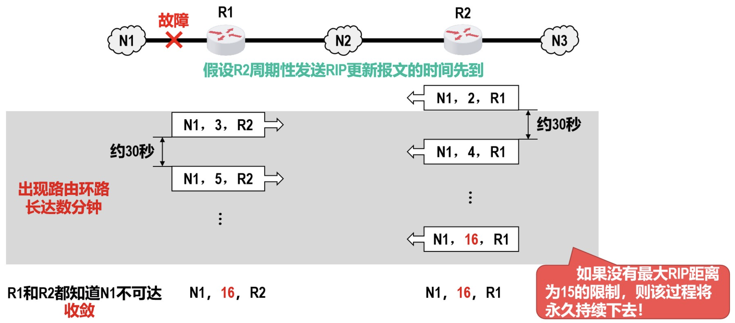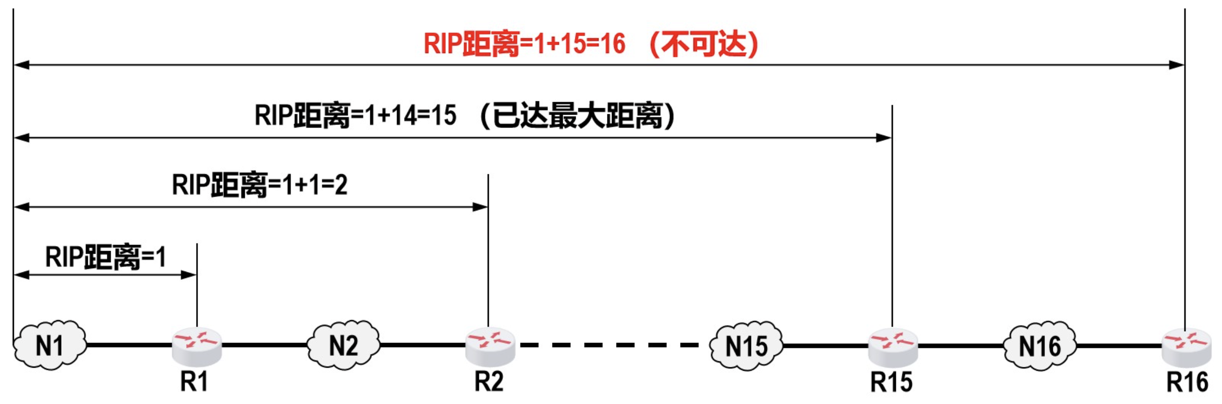 - 限制最大 RIP 距离 为 15(16 表示不可达)。