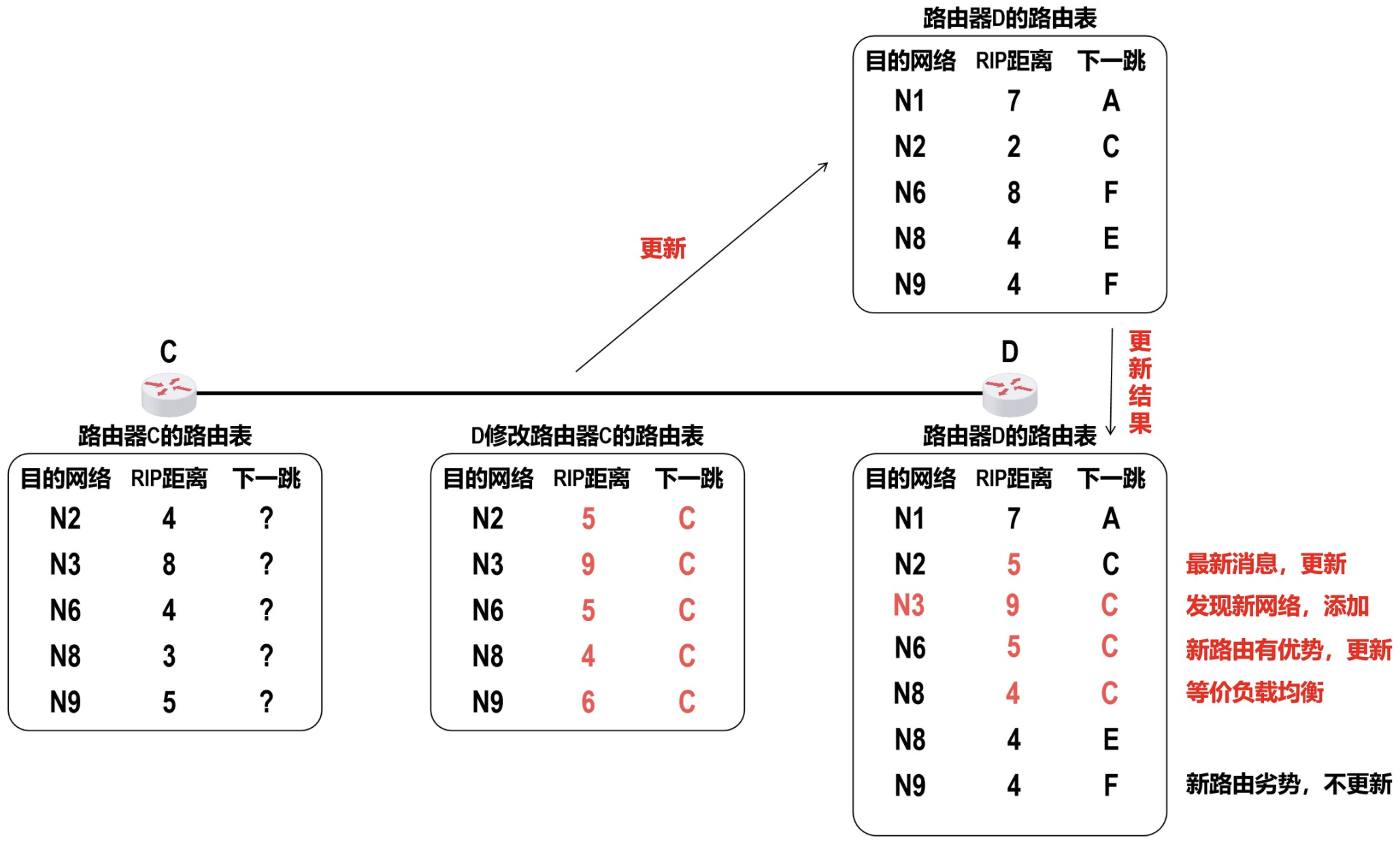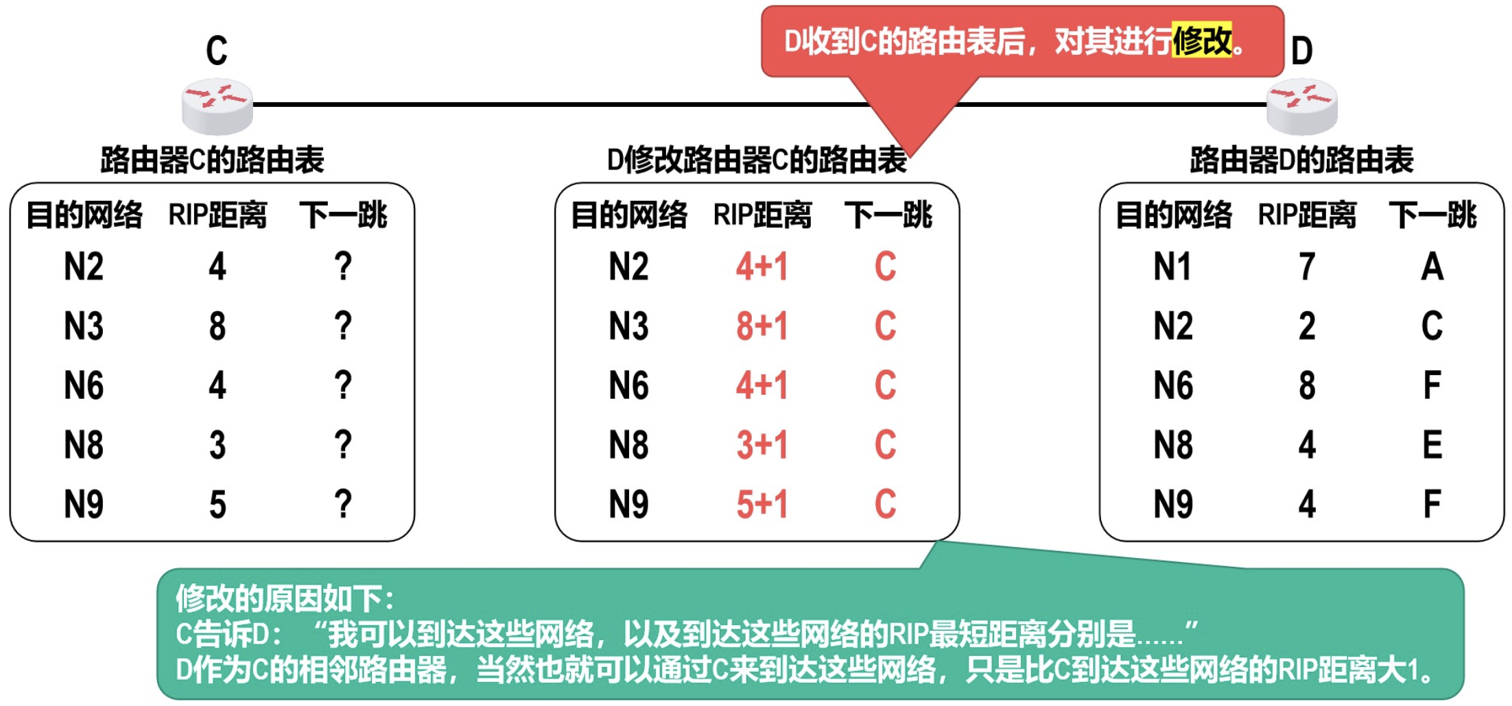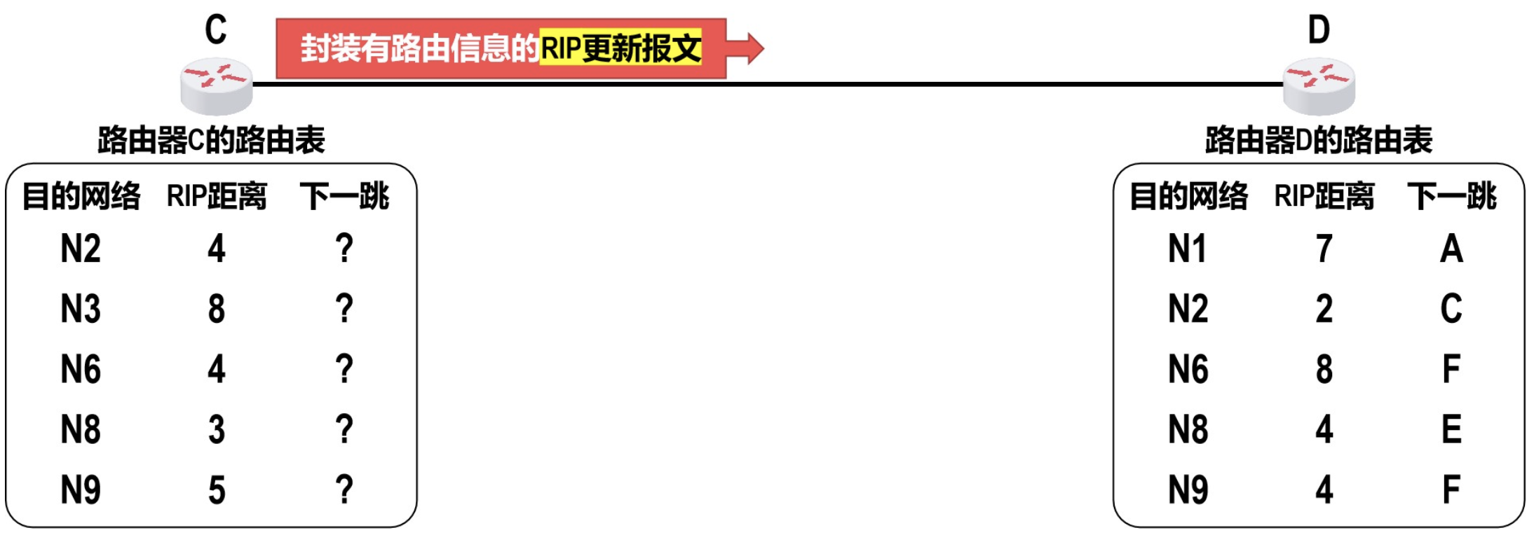 下面来举例说明,假设某一时刻,路由器 C 将自己的路由表封装在 RIP 更新报文中发送给路由器 D。