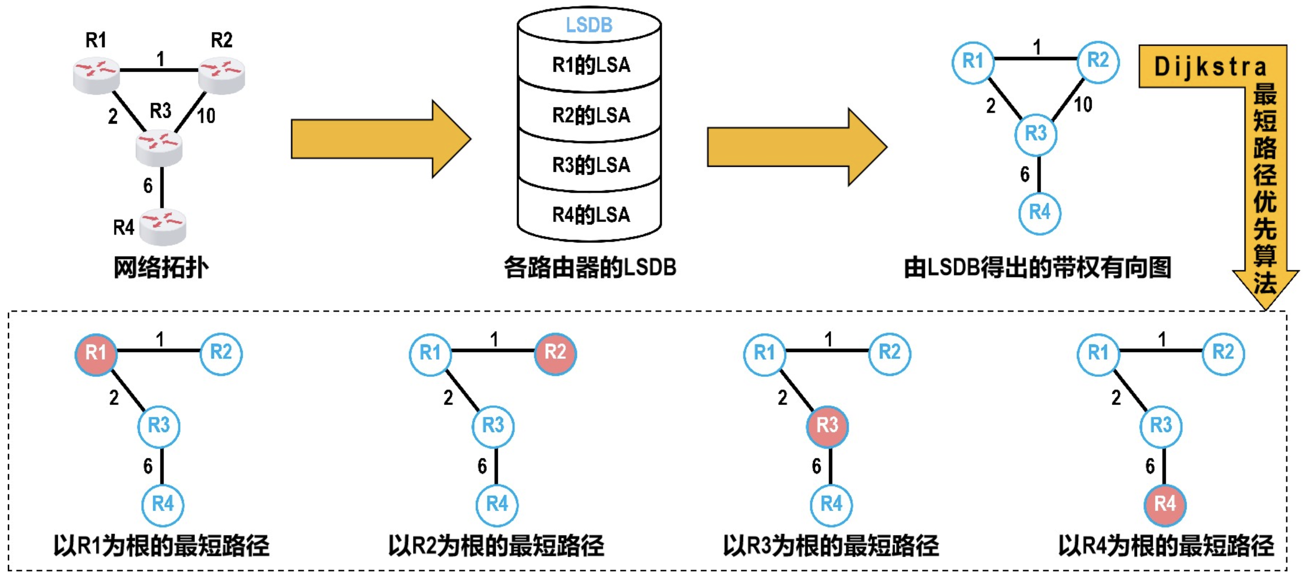 使用 OSPF 的各路由器,基于链路状态数据库 LSDB 进行最短路径优先计算,构建出各自到达其他各路由器的最短路径,即构建各自的路由表,如下图所示。