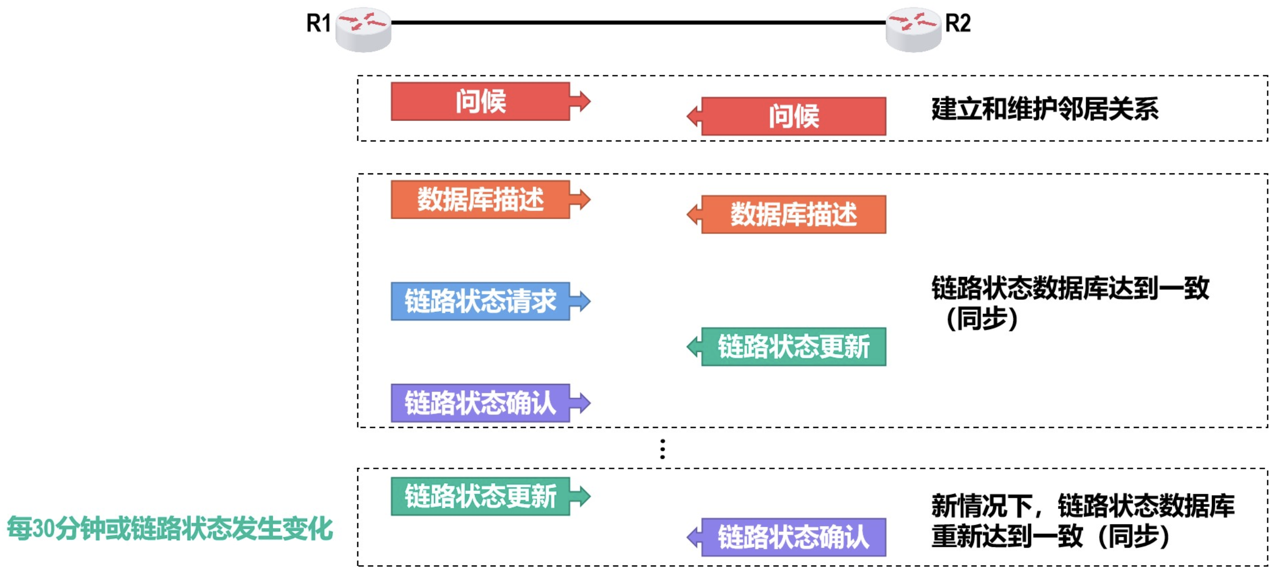 OSPF 相邻路由器之间通过交互问候(Hello)分组来建立和维护邻居关系。