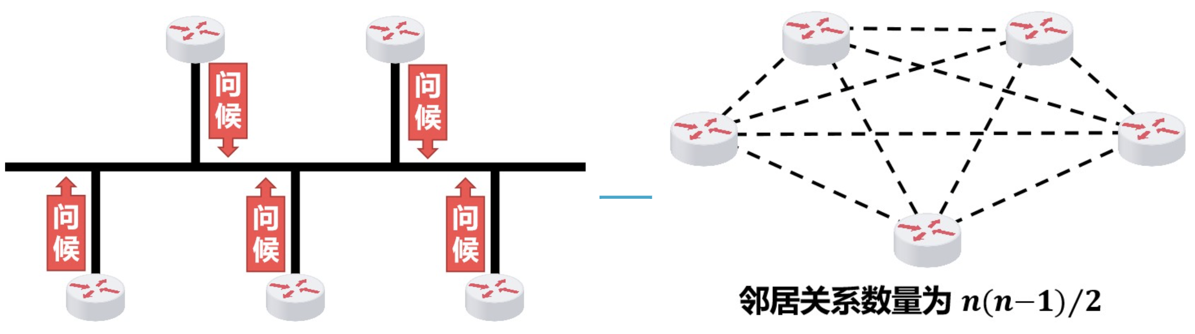 在多点接入网络中,如果不采用其他机制,OSPF 会产生大量的多播分组(即问候分组和链路状态更新分组),如下图所示。