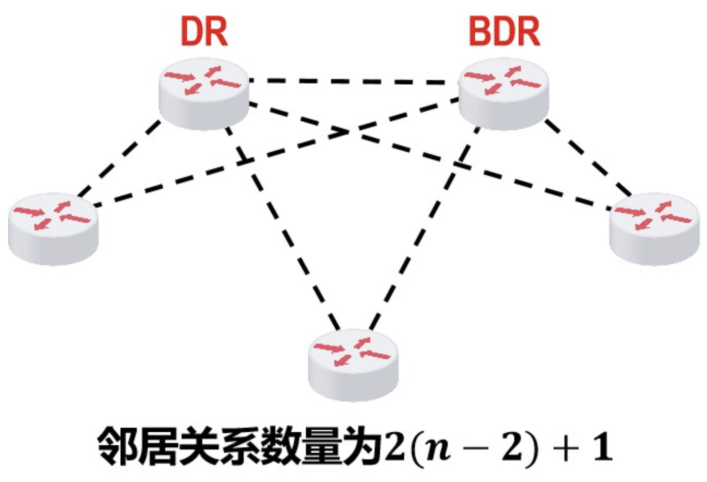 为了减少所发送分组的数量,OSPF 采用选举指定路由器(Designated Router,DR)和备用的指定路由器(Backup Designated Router,BDR)的方法。所有的普通路由器只与 DR 或 BDR 建立邻居关系,如下图所示。