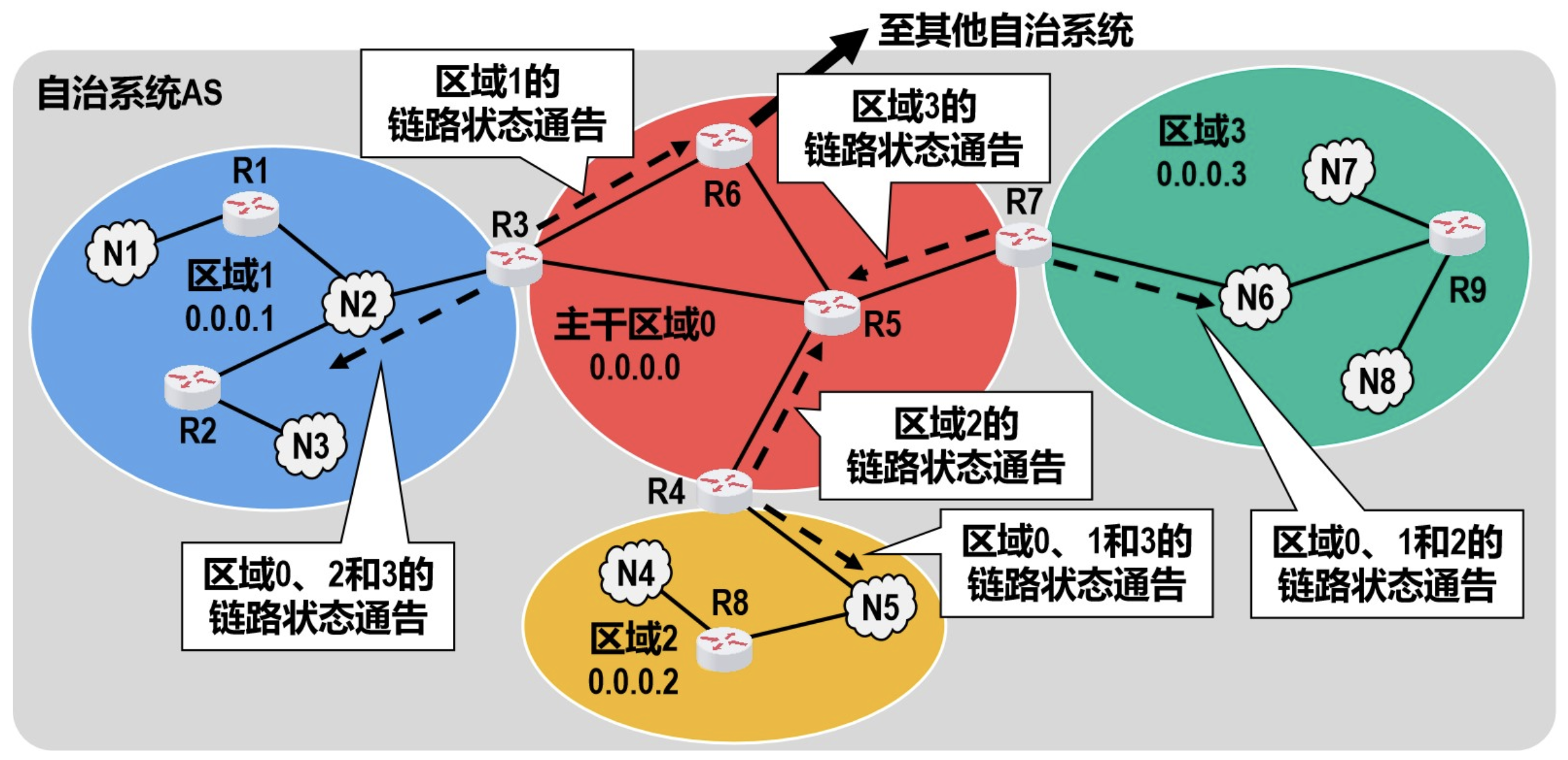 划分区域的好处就是把利用洪泛法交换链路状态信息的范围局限于每一个区域,而不是整个自治系统 AS,这样就 减少了整个网络上的通信量。