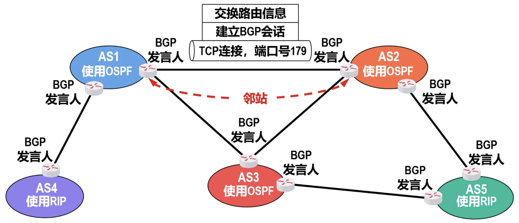 使用 TCP 连接交换路由信息的两个 BGP 发言人,彼此称为对方的邻站(neighbor)或对等站(peer)。BGP 发言人除了运行 BGP 协议外,还必须运行自己所在 AS 所使用的内部网关协议 IGP,例如 RIP 或 OSPF。
