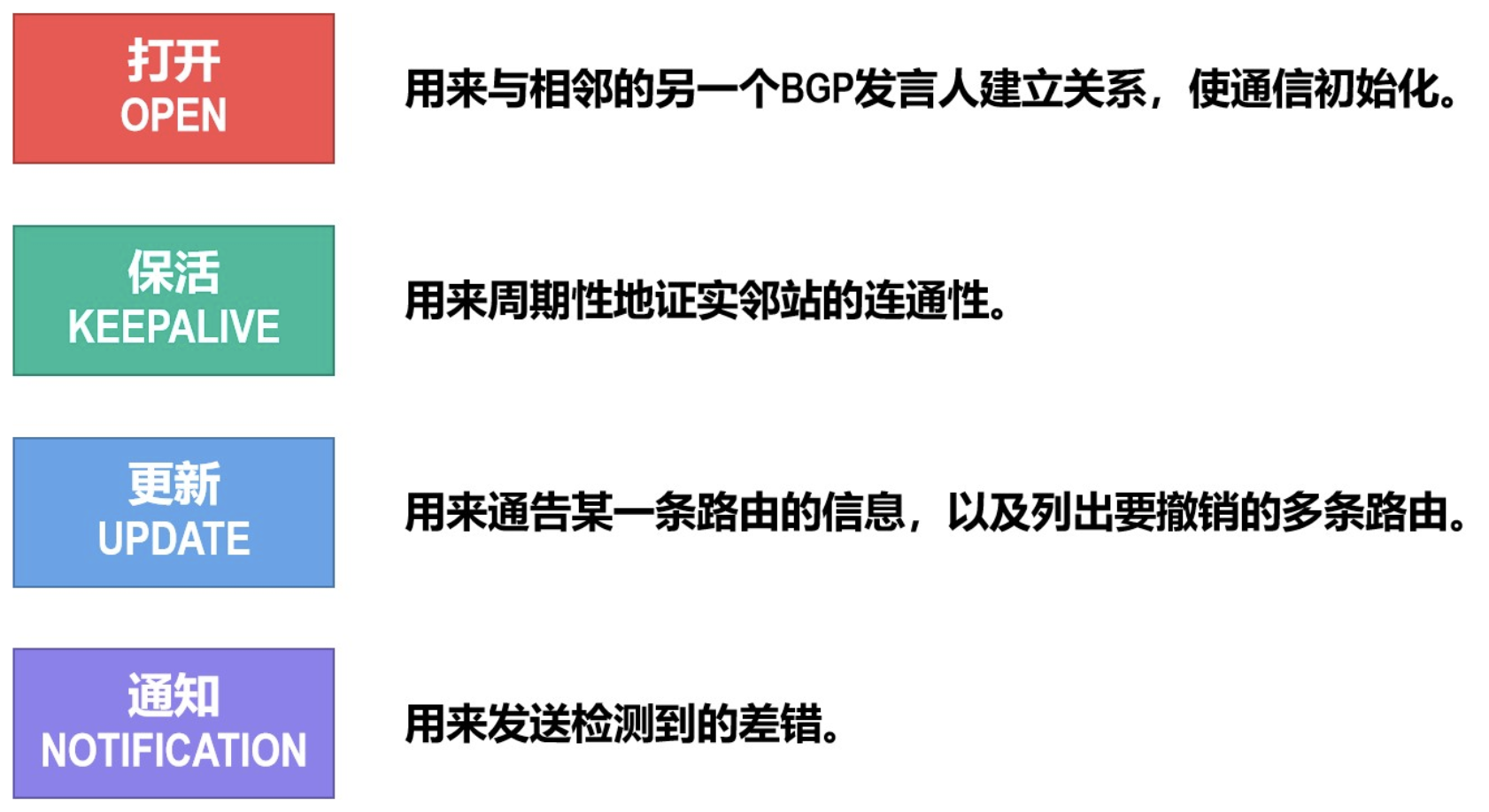 BGP-4 是目前使用最多的版本,在 [RFC 4271] (opens new window) 中规定了 BGP-4 的四种报文。