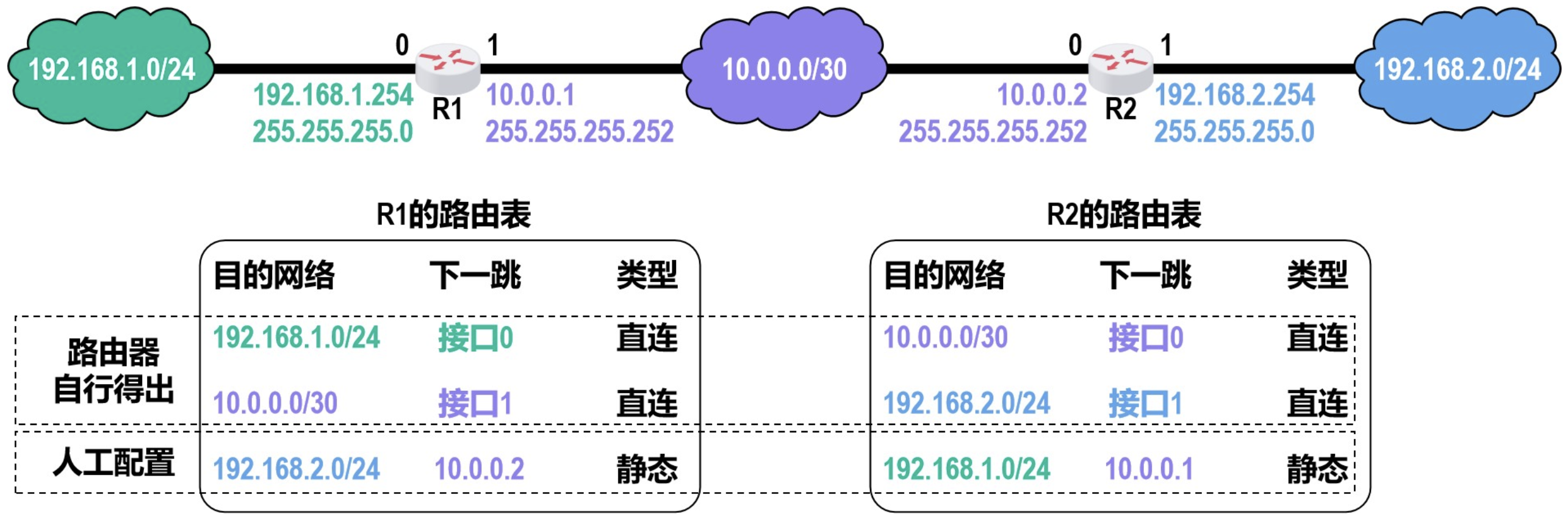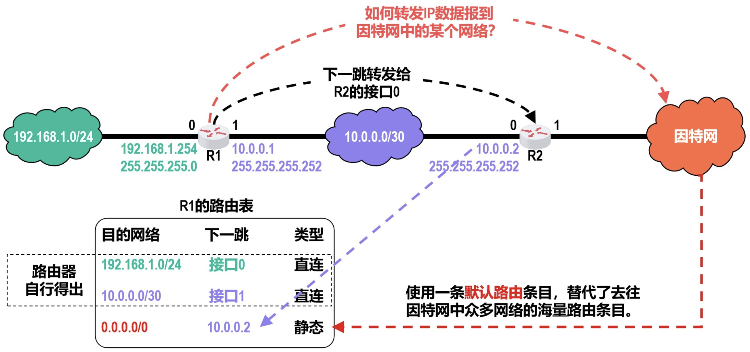 下面来举例说明直连路由和非直连路由的概念,如下图所示。