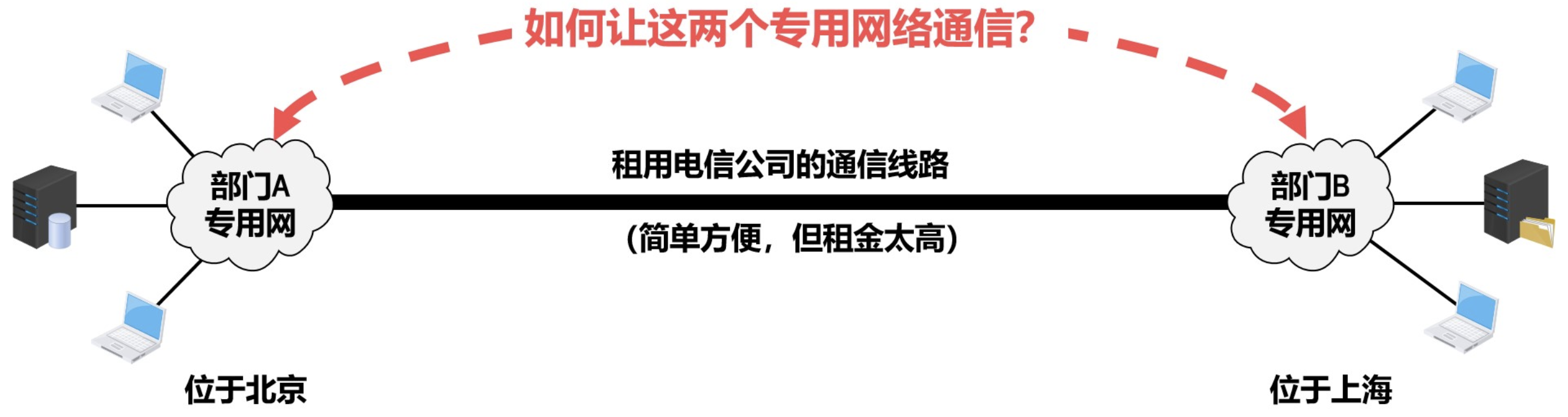 假设某大型机构的部门 A 位于北京,而部门 B 位于上海,每个部门都有自己的专用网。要使这些分布在不同地点的专用网通信,可以采用以下方法。