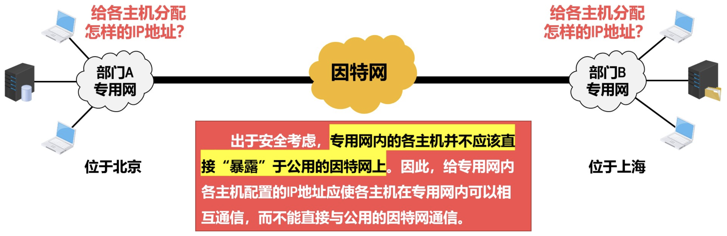 给专用网内各主机配置的 IP 地址应该是该专用网所在机构可以自行分配的 IP 地址,这类 IP 地址仅在机构内部有效,称为专用地址(Private Address),不需要向因特网的管理机构申请。