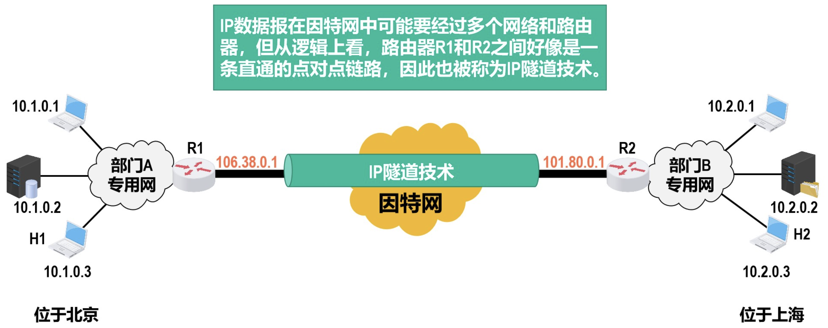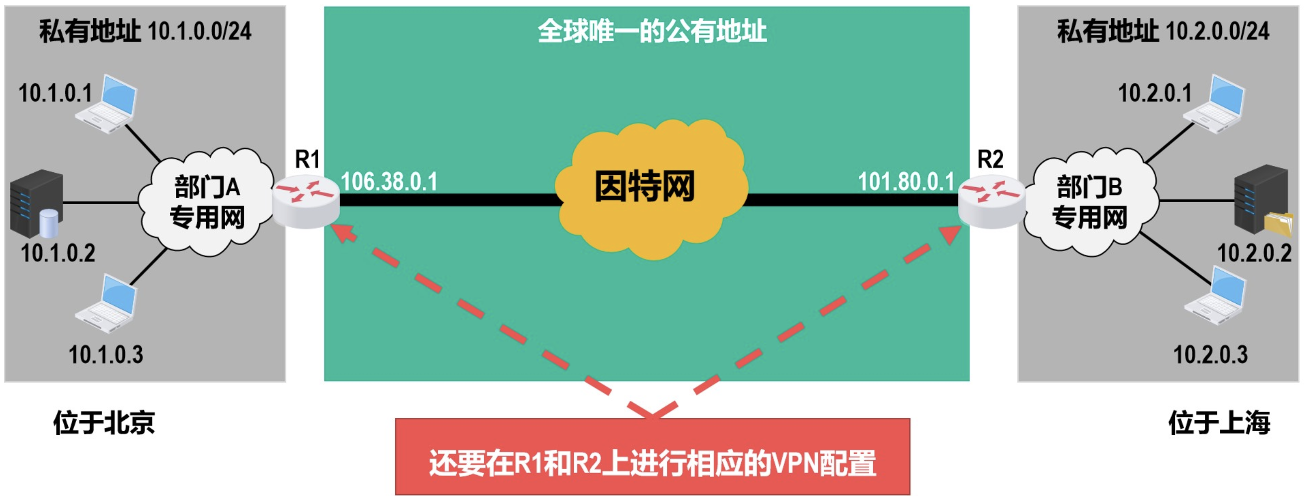 也可以利用公用的因特网作为本机构各专用网之间的通信载体,这样的专用网又被称为虚拟专用网,如下图所示。