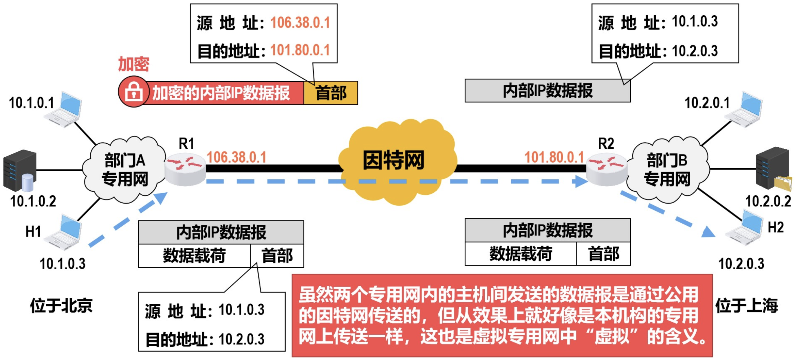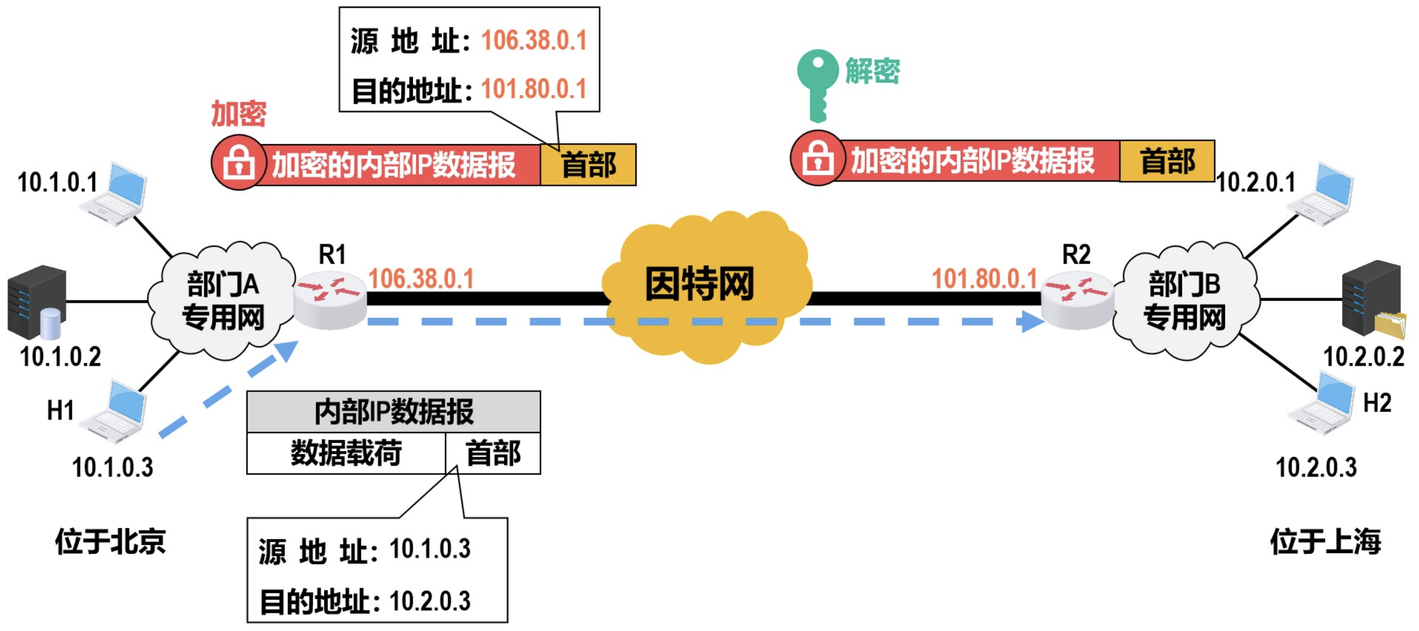 R1 收到该内部 IP 数据报后,发现其目的网络必须通过因特网才能到达,就将该内部 IP 数据报进行加密(这样就确保了内部 IP 数据报的安全),然后重新添加一个首部,封装成为在因特网上发送的外部 IP 数据报。