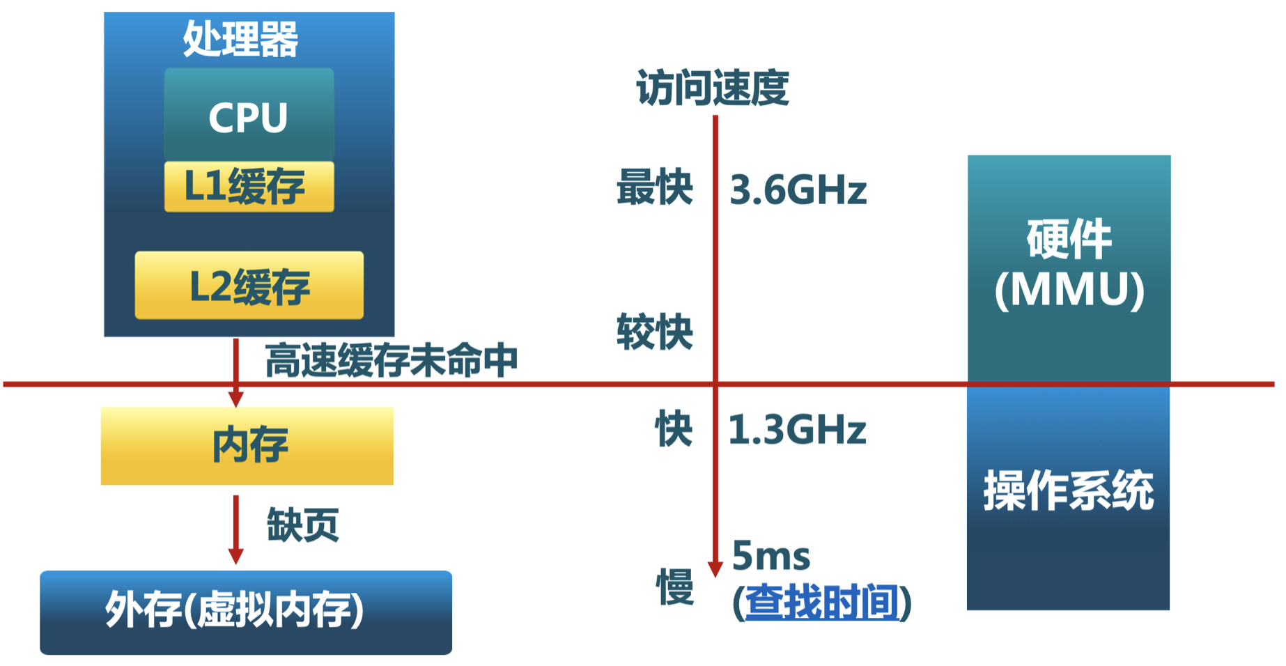 我们已经知道在 CPU 里有两级缓存,如果在读写数据或者指令的时候,在缓存里已经有相应的内容事先读取过,那这时候就可以直接从缓存里拿到,这时的速度是最快的;如果在这里缓存没有命中,那就必须要到内存中读取数据。