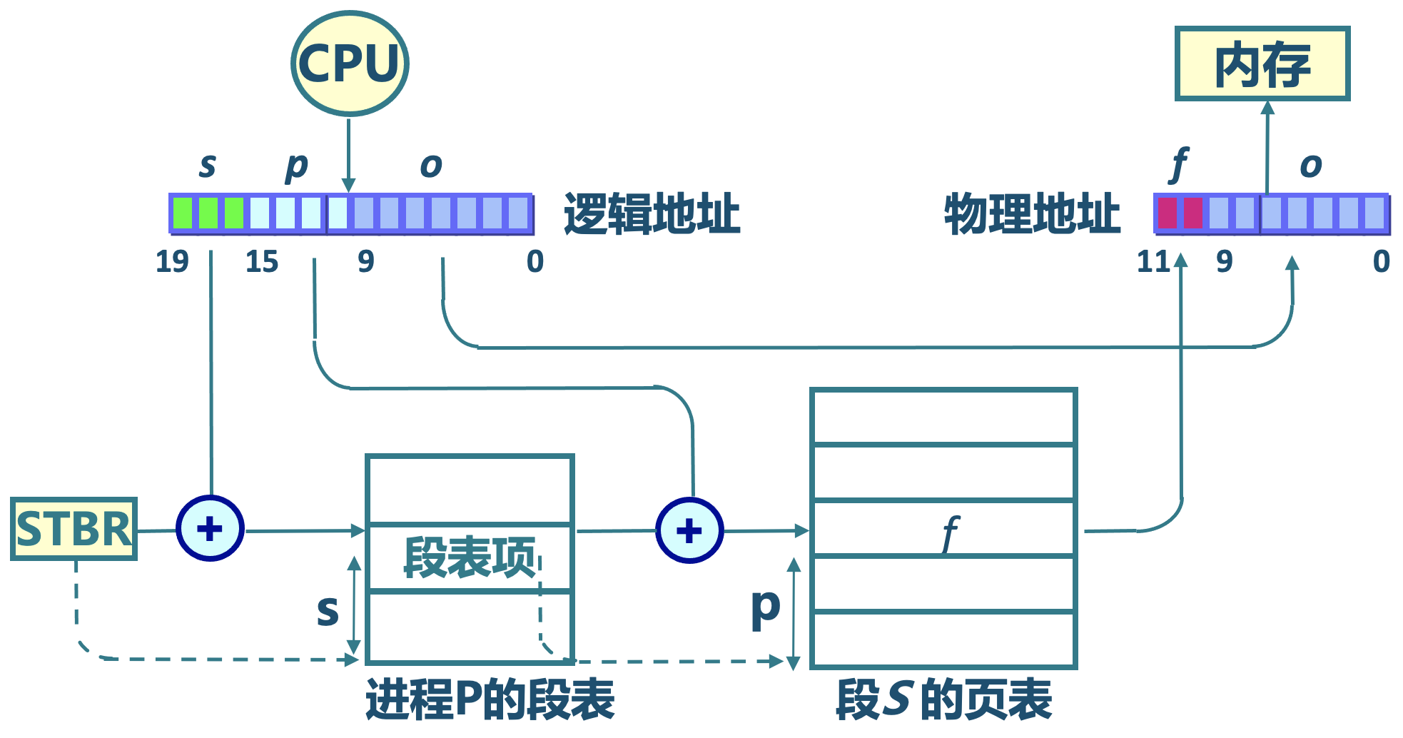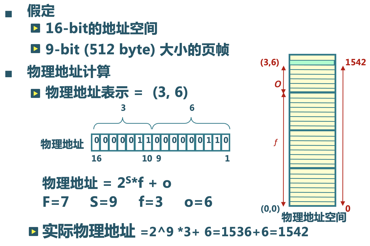 内存物理地址的表示:二元组 (f, o),其中 f 表示帧号(F 位,共有 个帧),o 表示帧内偏移(S 位,每帧有 个字节)。因此,物理地址 = 帧号 * 帧长度 + 帧内偏移 = f * + o