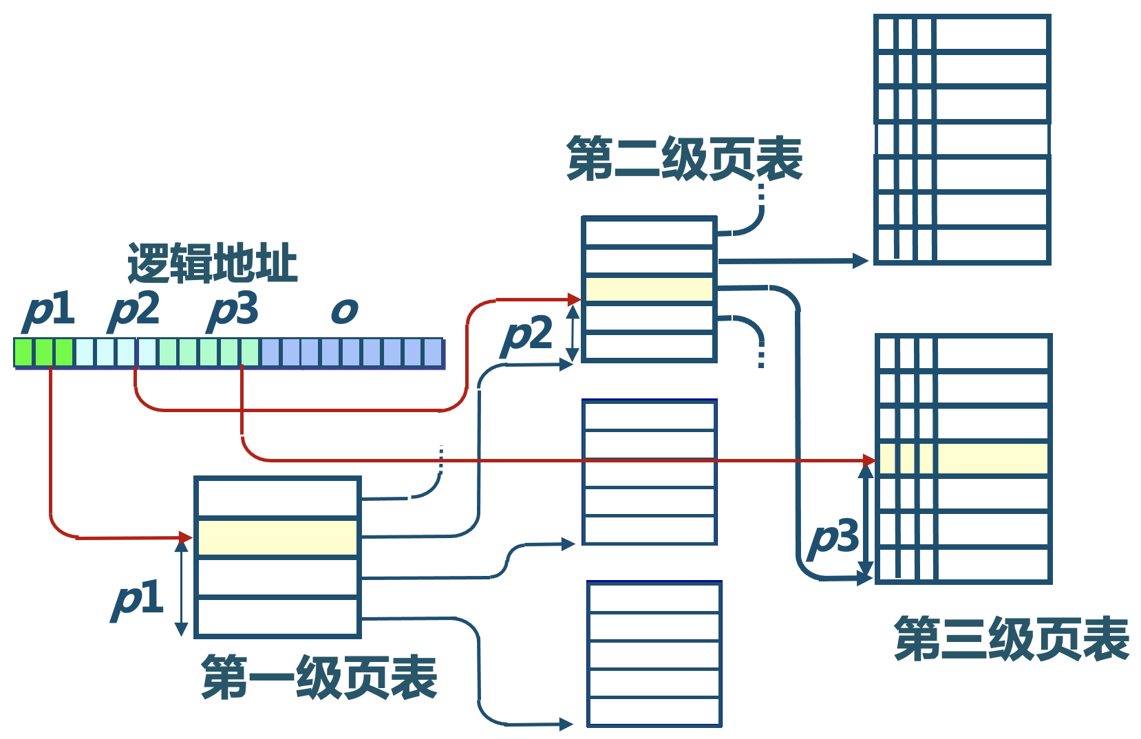 - 根据第一级页号 p1 与基址相加定位到对应页表项,获取到第二级页表的基址;