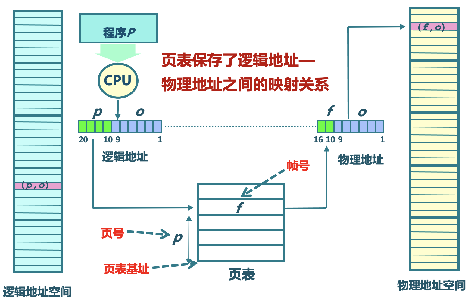 进程逻辑地址的表示:二元祖 (p, o),其中 p 表示页号(P 位,共有 个页),o 表示页内偏移(S 位,每页有 个字节)。因此,逻辑地址 = 页号 * 页长度 + 页内偏移 = p * + o