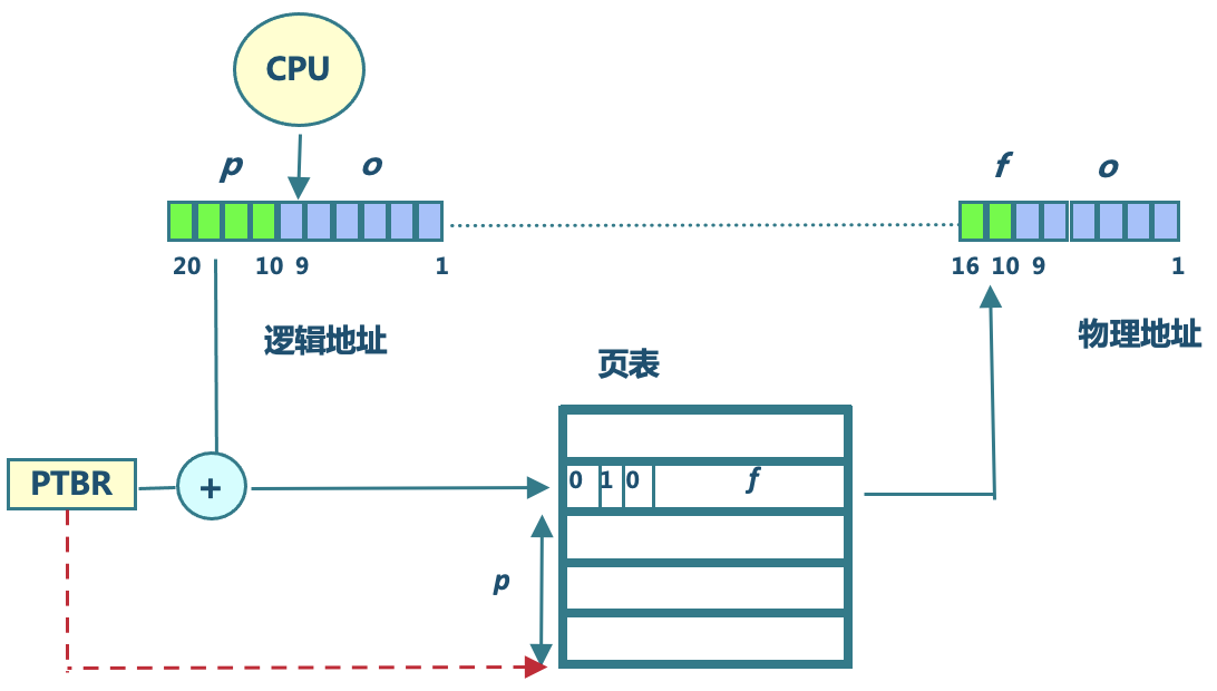 - 在页表基址寄存器(PTBR:Page Table Base Register)中记录页表的起始位置。