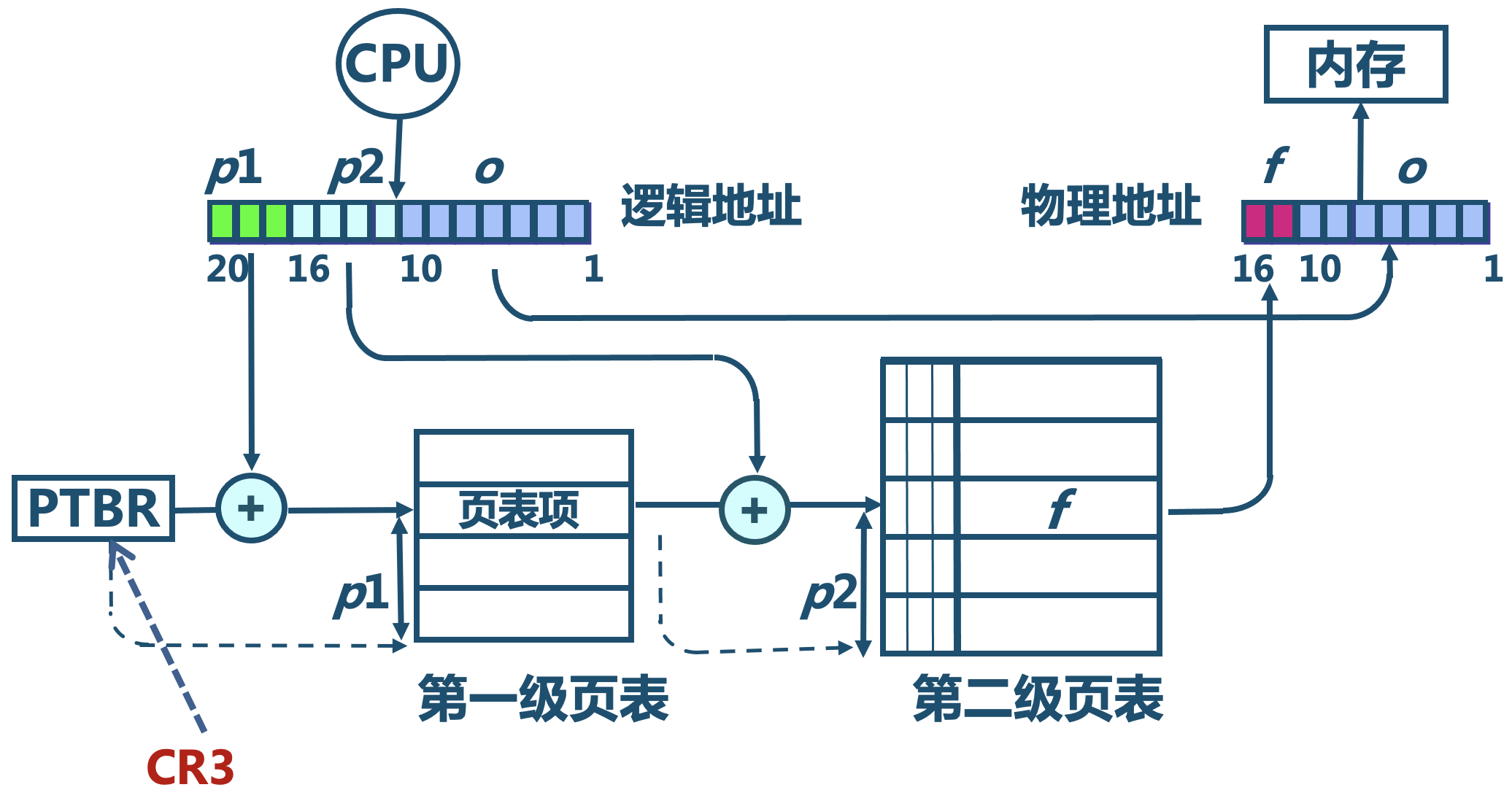- 程序在 CPU 上执行,要访问一个存储单元的时候,首先得到它的逻辑地址,将其分为页号和页内偏移;