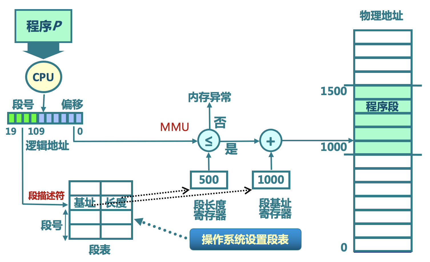 - 根据段号去查进程的段表,得到段描述符(记录段起始地址和长度);