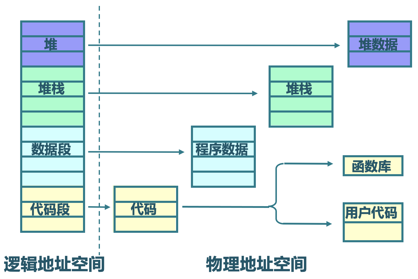 段访问:逻辑地址由二元组 (s, addr) 表示,其中 s 为段号,addr 为段内偏移。