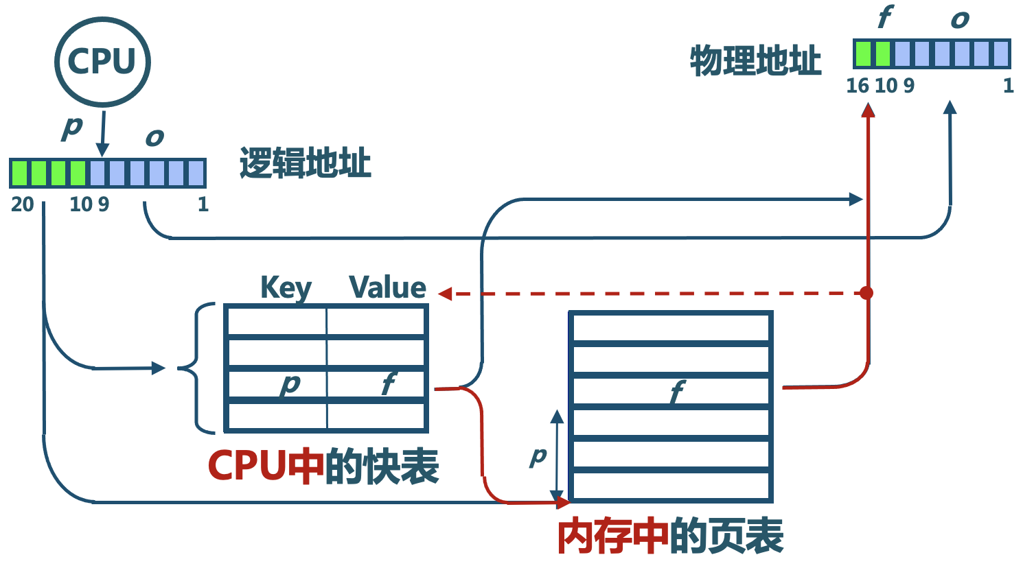 - TLB 使用关联存储(associative memory)实现,具备快速访问性能;
