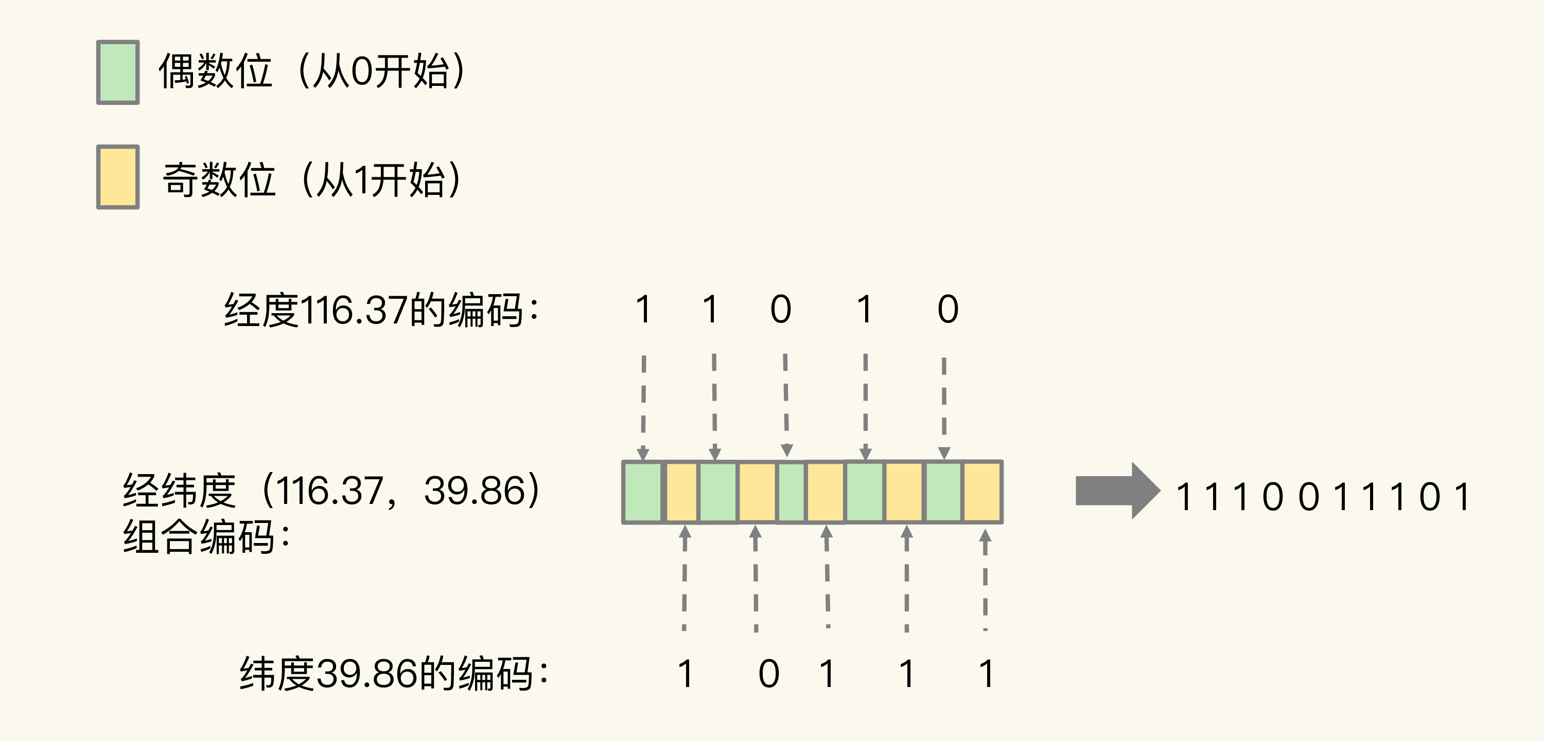 当一组经纬度值都编完码后,我们再把它们的各自编码值组合在一起,组合的规则是:最终编码值的偶数位上依次是经度的编码值,奇数位上依次是纬度的编码值,其中,偶数位从 0 开始,奇数位从 1 开始,如下图所示。